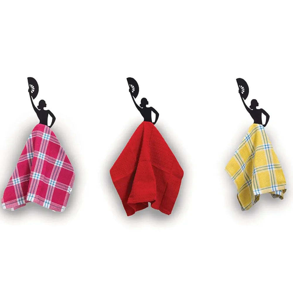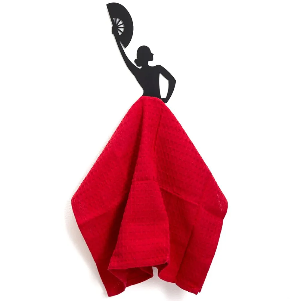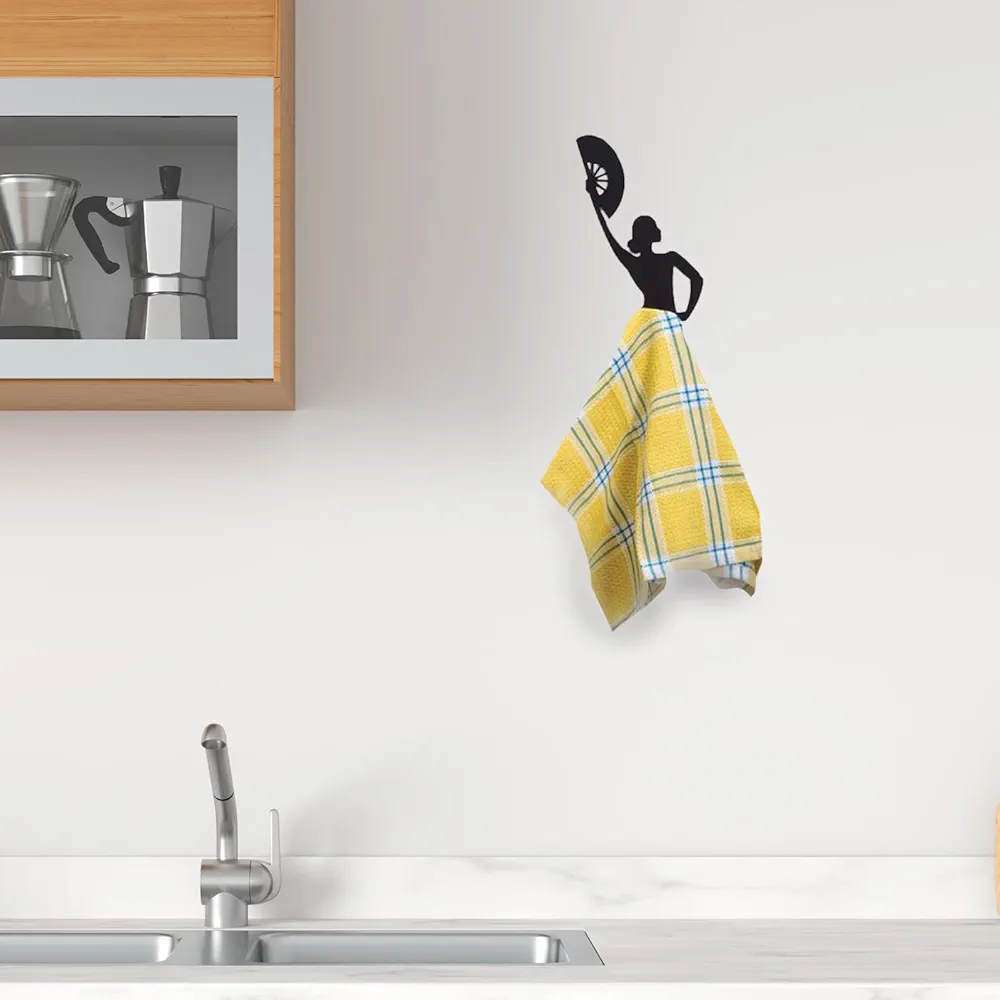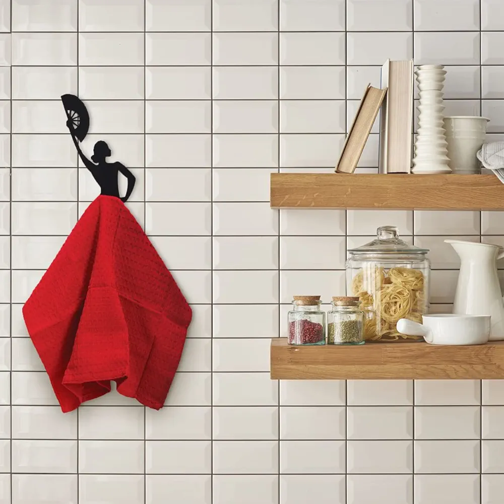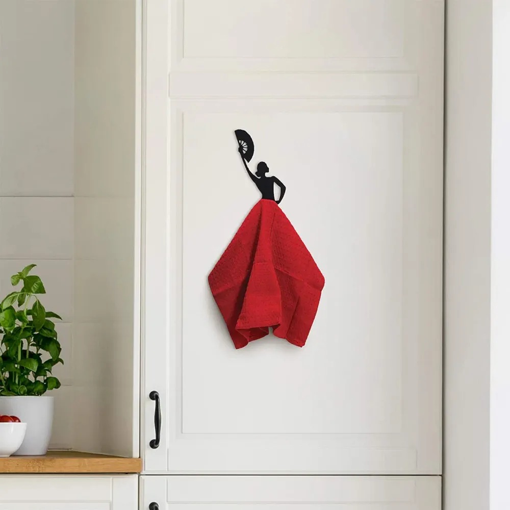 - این آویز با الهام از فرم یک بانو طراحی شده که در حال نگهداشتن یک بادبزن است. طراحی سیلوئتگونه آن، حس حرکت و ظرافت را به فضای آشپزخانه منتقل میکند.- هنگامی که حوله آشپزخانه از آن آویزان میشود، به شکل دامن بانو درمیآید و جلوهای هنری و چشمنواز ایجاد میکند.- مناسب برای نصب روی دیوار یا کابینت بهویژه در فضاهای مدرن یا مینیمال که به جزئیات بصری اهمیت میدهند.همچنین بدلیل فلزی بودن این محصول میتوانآن را با آهنربا بهمکان های فلزی مثل کنار یخچال و ... نصب کرد